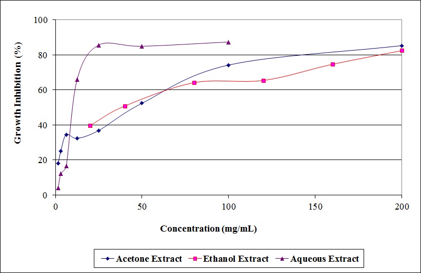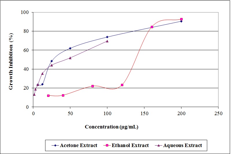 The acetone extract at the highest concentration (400 μg/ml) was highly cytotoxic, causing the death of 98.26±0.67% of the Vero cells. Concentrations of 200 μg/ml caused the death of 99.10±1.56% of the cells. By contrast, the ethanol and aqueous extracts, at the same highest concentration (400 μg/ml) resulted in the death of only 11.34±6.38% and 8.69±6.32% of the Vero cells, respectively. The IC50 values for the acetone, ethanol and aqueous extracts were 23.37±5.63, 629.46±24.85 and 634.00±144.82 μg/ml, respectively (table 1). Statistical analysis using ANOVA (p = 0.05) revealed a significant difference between the three extracts (p = 0.00).