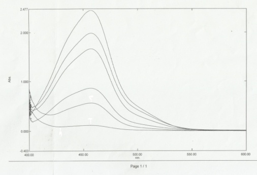 The developed yellow coloured chromogen of standard and sample solutions against the reagent blank was scanned between 400 nm to 600 nm and the absorbance maxima at λ 458 nm. Figure 3 & 4.