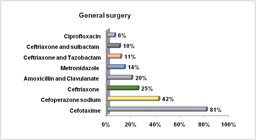A total of 284 patients were included in the study, out of which 141(49.6%) were females and 143(50.4%) were males. In the department of general surgery, the surgeries performed frequently were appendicectomy (21%) followed by hernioplasty (17%), abdominal meshplasty (15%), haemorrhoidectomy (13%), cholecystectomy (9%), lipoma and granuloma excision (7%). In the above conditions, the commonest antimicrobial agents used were cefotaxime (81%) followed by cefoperazone sodium (42%), ceftriaxone (25%), amoxicillin with clavulanate (20%) and metronidazole (14%) (table 1, fig. 1).