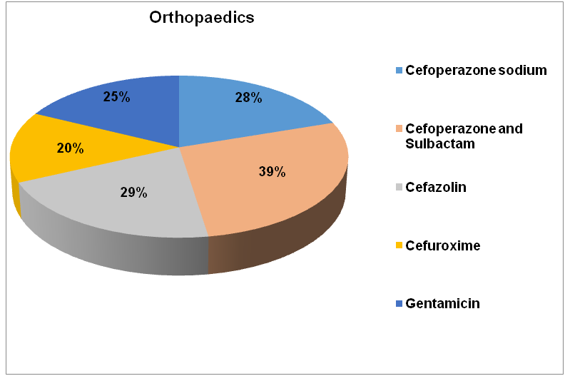 In the orthopaedics department, surgeries done very often were Open Reduction and Internal Fixation-ORIF (43%), plate and screw fixation (21%), laminectomy and discectomy (10%). In these, the commonest antimicrobial agents used were cefoperazone with sulbactam (39%), cefazolin (29%), cefoperazone sodium (28%), gentamicin (25%) and cefuroxime (20%) (table 2, fig. 2).