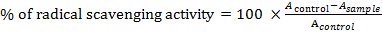 The AA of all the four extracts were quantitatively assessed on the basis of free radical scavenging activity of stable DPPH radical according to the reported method of Brand-Williams et al. 1 ml of plant extract solution of various concentrations, ranging from 0.05-0.20 mg/ml was mixed with 1 ml of 0.5 mmol DPPH solution in methanol. Incubation of the resulting solution was carried out for 30 min in dark room at 37 °C. BHT was used as the positive control under the same assay condition. The absorbance was measured calorimetrically at 517 nm. The experiments were carried out in triplicate. The percentage inhibition was calculated using the following formula.
