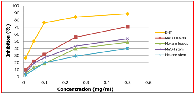 DPPH radical is widely used as a model to determine the scavenging potential of several natural compounds such as phenolics or crude extract of plants [17]. The basic principle of DPPH method is based on the reduction of DPPH in the presence of a hydrogen donating antioxidant. The degree of discoloration indicates the scavenging potential of antioxidant compounds of the extracts. The absorption strength decreases in the presence of a free radical scavenging antioxidant. The leaves and stem of A. sessilis red in different organic solvents were tested for their free radical scavenging activity using DPPH assay. The results obtained showed an increase in the percentage inhibition as the concentration increases. The highest percentage inhibition exhibited by BHT was 88.84 %. Meanwhile, for the methanolic leaf extract, methanolic stem extract, hexanolic leaf extract and hexanolic stem extract the highest percentage inhibition were 70.81 %, 53.74 %, 48.66 % and 40.10 % respectively. The higher is the percentage inhibition, the higher is the AA (fig.2). Furthur, the IC50 value was calculated. IC50 value is the concentration of sample at which the inhibition percentage reaches 50%. In the case of methanolic extract, the IC50 was reported to be 0.194±0.003 mg/ml and 0.470±0.006 mg/ml for leaves and stem extracts, respectively. Whereas, for hexanolic extracts the IC50 was reported to be 0.786±0.002 mg/ml for leaf and 2.026±0.003 mg/ml for stem, respectively. BHT was used as standard had IC50 value of 0.037±0.002 mg/ml (fig. 3). The difference in their IC50 value is due to the presence of different phytochemicals in different crude extracts of Alternanthera sessilis red leaves and stem. The lower the IC50 value, the higher the free radical scavenging activity. Therefore, methanolic leaf extract displayed the strongest free radical scavenging properties over the rest three when compared to BHT.
