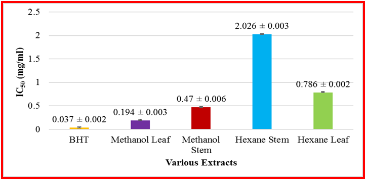 Conclusion: TPC was found to be more than TFC. Methanolic extract (highly polar) was reported to display higher TPC and AA when compared to DCM. Among the methanolic and hexanolic extracts of leaves and stem, the AA was reported highest for the methanolic leaf extract.