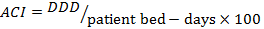 Data obtained were assessed the use of antibiotics in a quantity which is calculated using ATC/DDD index. In this study, DDDs of anti-infective agents are listed for systemic use, according to ATC/DDD 2016 Index. The DDD is the assumed average maintenance dose per day for a drug used for its main indication in adults and a DDD will only be assigned to drugs that already have an ATC code. The DDD value in grams of every drug is defined by the WHO and is periodically updated. DDD values of every antibiotic are calculated separately [8]. In this calculation method, the form used for in-bed patients is the ratio of the total DDD per 100-bed-days. This index is called antimicrobial consumption index (ACI) [6]. Calculate ACI use equation [11]: