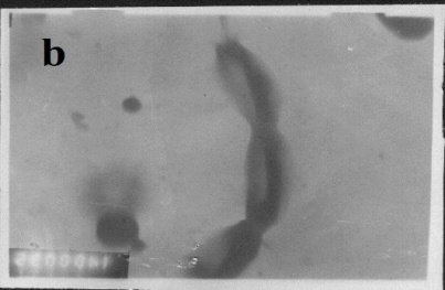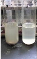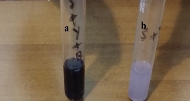 Fig. 1: (a) Tube (a) inhibition of α-glucosidase activity by cell free extract of strain AD-7 up to fifth day of incubation at 37 °C; tube (b) hydrolyzed starch by α-glucosidase activity. (b) tube (a) disappearance of dark blue color after fifth day of incubation at 37 °C due to degradation of α-glucosidase inhibitor in the cell free extract of strain AD-7; tube (b) hydrolyzed starch by α-glucosidase activity, n = 1