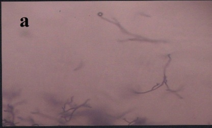 Fig. 2: (a) Microphotograph (x 1500) of actinomycete strain AD-7. (b) transmission electron micrograph (x 21 000) of actinomycete strain AD-7, n = 4