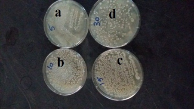 Fig. 4: Morphological changes of mutant strain on agar medium due to exposure to UV rays at different time periods: (a) 5 s (b) 10 s (c) 15 s (d) 30 s, n = 8
