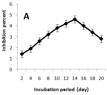 There ten Erlenmeyer flasks (250 ml) contained 100 ml of starch nitrate broth at pH 7.2 were inoculated by equal inoculum of mutant actinomycete isolate AD-7, and then incubated with shaking at 30 °C and 160 rpm for different incubation periods (2, 4, 6, 8, 10, 12, 14, 16, 18, and 20 d). The antidiabetic activity was measured as mentioned above.