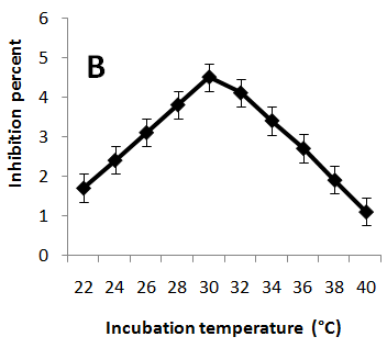 There ten Erlenmeyer flasks (250 ml) contained 100 ml of starch nitrate broth at pH 7.2 were inoculated by equal inoculum of mutant actinomycete isolate AD-7, and then incubated with shaking at 160 rpm for different incubation temperature (22, 24, 26, 28, 30, 32, 34, 36, 38, and 40 °C) for 14 d. The antidiabetic activity was measured as mentioned above.