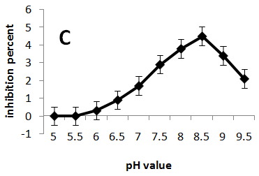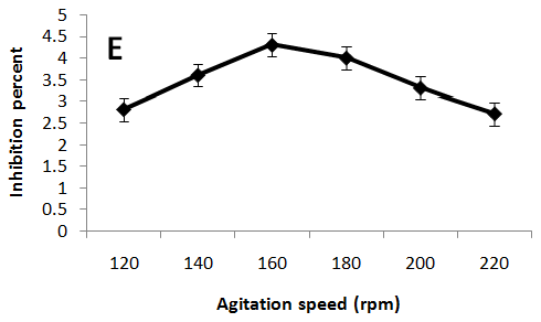 All optimum environmental factors were determined to obtain a maximum activity and stability of α-glucosidase inhibitor that produced by a mutant strain. The best incubation periods (fig. 5A), incubation temperature (fig. 5B), pH value (fig. 5C), inoculum size (fig. 5D), and agitation speed (fig. 5E) were determined at 14 d, 30 °C, 8.5, 106 cfu/ml (300 µl), and 160 rpm respectively. Fei Ren et al. [43] stated that, the effect of pH on Streptomyces M37 growth and α-glucosidase inhibitor production was determined, where the initial pH ranged from 6.5 to 8.5. The highest dry cell weight (DCW) (21.58 g/l) was achieved at an initial pH of 7.0, and then decreased at pH up to 8.0. The maximum yield of α-glucosidase inhibitor (173.7 mg/l DCW) was obtained at an initial pH of 8.0. At 3345 mg/l, α-glucosidase inhibitor production was higher at an initial pH of 8.0, than at other initial pH values. At the same time, specific α-glucosidase inhibitor production (Cmax mg/l DCW) increased along with initial pH (in the 6.5 to 8.0 range). Accordingly, the high growth was correlated with a low initial pH, but on the other hand, the highest activity and productivity of α-glucosidase inhibitor were associated with a high initial pH value. These results were found closely related with those of Zhuge et al. [44].