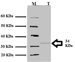 Many studies which have been conducted in this field isolated and purified an intracellular α-glucosidase inhibitor. However, the concerned α-glucosidase inhibitor in this study is an extracellular secondary metabolite that has a peptide nature. The stepwise purification process was carried out by using diethyl-aminoethyl-cellulose and sephadex G 200 in an ion exchange and gel filtration column chromatography respectively. The purified protein was separated as a single band at 34 KDa by using sodium-dodecyl-sulphate-polyacrylamide gel electrophoresis (fig. 6). Therefore, there is a new fact has been recorded, where there are two types of α-glucosidase inhibitor according to the secretion site; intracellular and extracellular α-glucosidase inhibitor.