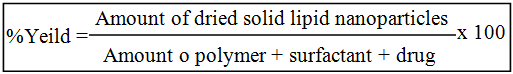 The total amount of nanoparticles obtained were weighed individually for each batch and percentage yield was calculated taking into consideration the weight of drug and polymer by using the following formula and observations are shown in table 1.