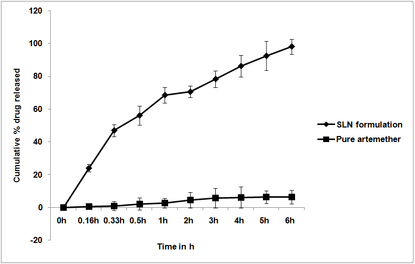 In vitro release studies were performed using modified Franz diffusion cell. Dialysis membrane of 2.4 nm pore size, molecular weight cutoff between 12,000–14,000 was used for the study. Nanoparticulate formulation (10 mg) was dispersed in 1 ml of dissolution medium and placed in the donor compartment and the receptor compartment was filled with dialysis medium (25 ml phosphate buffer, pH 6.4). At fixed time intervals, 2 ml of the sample was withdrawn at different time intervals for 6 h through side tube from receiver compartment. Fresh medium was added to maintain a constant volume. The artemether content was estimated using Shimadzu UV/visible spectrophotometer at wavelength 254 nm and the percent drug release at the particular interval was calculated. The release study was also carried out for a pure drug for comparison with artemether formulation. The percent cumulative drug release of optimized solid lipid nanoparticles and pure drug are shown in fig. 2.