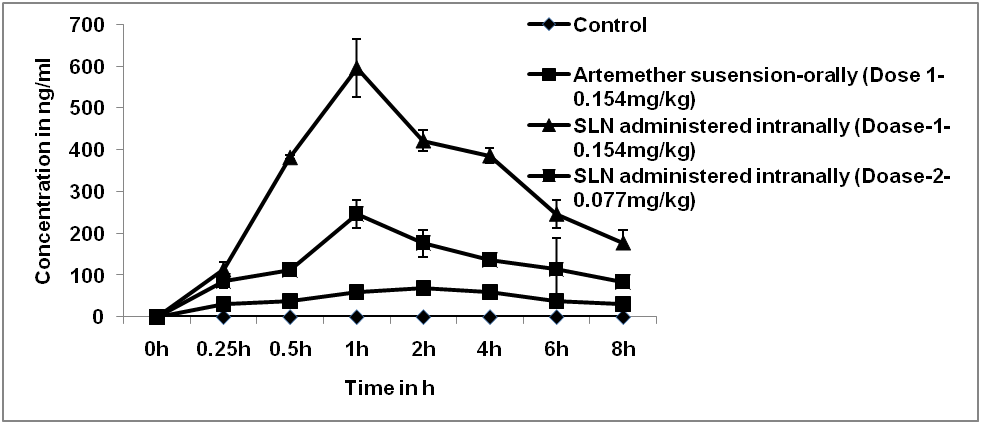 The results showed that plasma T1/2 was found to be 4.95 h when nanoparticles administered intranasally, while it was found to be 2.4 h when artemether suspension administered orally which is attributed to the capability of the intranasal formulation to sustain the release and maintain the effective concentration of artemether in cerebrospinal fluid. The higher concentration (644.6 ng/ml) was achieved in brain after intranasal administration of artemether containing formulation in 1 h than that achieved (69.20 ng/ml) in 4 h after same dose of oral administration of artemether suspension which is attributed to nanosize of formulation that may enter the brain directly when administered through intranasal route which will not only provide fast effective action, it would also release the drug in brain in a sustained manner and would be able to remove malaria parasite from brain.