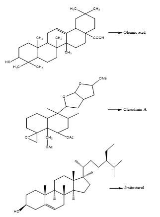 The chemical compound isolated from the roots are Luperol, β-sitosterol, the sterol known as Clerosterol identified as 5, 25- sigmastadien_3β-ol, Clerodolone as lup_20 (30)-en- 3β-diol-12-one and clerodone as 3β-hydroxylupan- 12-one and a steroidal glycoside (Jorn. Ind. chem. society.1967, 44, 549). Abbaszadeh et al. reported isolation of three compounds identified as clerodin, 15-methoxy-14, 15-dihydroclerodin and 15-hydroxy-14, 15-dihydroclerodin from this plant Besides the above major chemicals found in the Clerodendrum genus the other constituents are carbohydrates, phenolic, flavonoids, terpenoids, sugars and steroids [16].