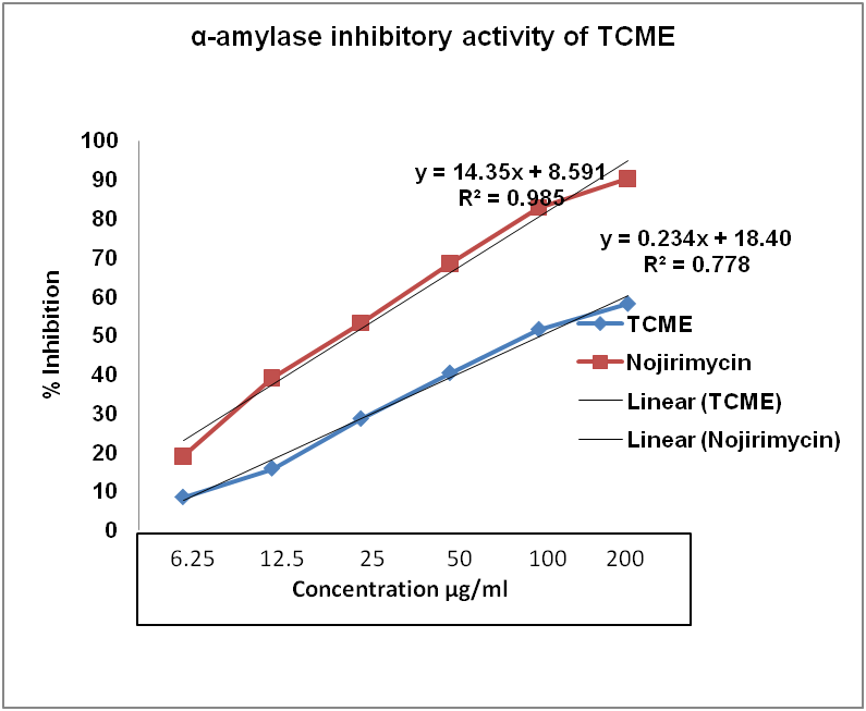 To amylase inhibitory effect of methanol extract of Tephrosia calophyllawas tested to determine the ability of the drug to reduce postprandial glucose. In this study, TCME exhibited strong inhibitory activity against α-amylase with IC50 of 135.042μg/ml, which is comparable with positive controls [table 4 and fig. 3].