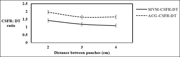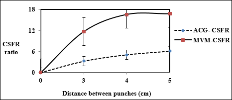 Fig. 2: Effect of distance between punches on the mechanical strength of tablets containing 2.0% w/w M. verticillata mucilage and acacia gum as a binder, mean±SD, n=3, p<0.01. ACG-CSFR and MVM-CSFR is the crushing strength-friability ratio of tablets containing acacia gum and M. verticillata mucilage as tablet binder, respectively