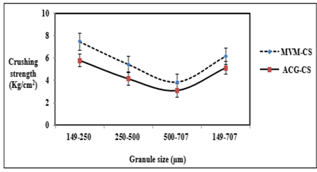 Fig. 3a: Effect of granule size on crushing strength of tablets, mean±SD, n=3, p˂0.05 ACG-CS and MVM-CS is crushing strength of tablets containing acacia gum and M. verticillata mucilage, respectively