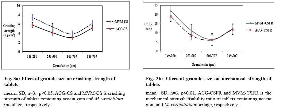 Fig. 3a below shows that crushing strength decreased significantly (F(4, 10) =405.475, P<0.05) with an increase in granule size. Tablets obtained from the initial granule mixture (149-707 µm) were stronger than those obtained from 500-707 µm. This was due to wider particle size distribution, better packing rearrangement and extra adhesive bridges by fines in void spaces. Small sized granules (149-250 µm) on compression yielded stronger tablets as they packed well and had a larger surface area which contributed to the formation of strong inter-particulate bonding. Larger sized granules (500-707 µm) have smaller surface area and high void spaces resulting information weak inter-particulate bonds in compressed tablets [28]. Lack of fragmentation of the large mucilage granules resulted in to weaker tablets [8]. Analysis of the result shows the insignificant difference (p˃0.01) between mechanical strength of MVM and ACG tablets obtained from compressing granules of different size (fig. 3b).
