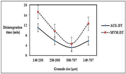 Fig. 4a: Effect of granule size on disintegration time of tablets, mean±SD, n=3, p˂0.01 ACG-DT disintegration time of tablets containing acacia gum and M. verticillata mucilage, respectively