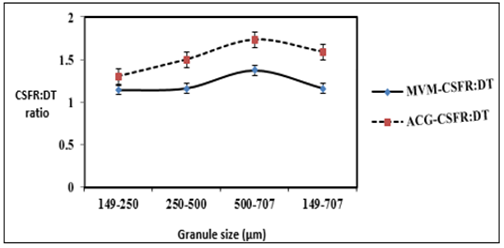Fig. 3b: Effect of granule size on the mechanical strength of tablets, mean±SD, n=3, p˂0.01 ACG-CSFR and MVM-CSFR is the mechanical strength-friability ratio of tablets containing acacia gum and M. verticillata mucilage, respectively