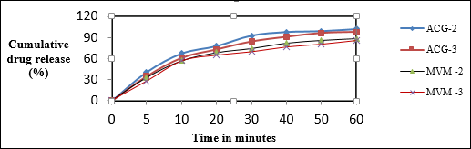 Effect of the amount of MVM and ACG on the mechanical strength of tablets are presented in table 3 below. Friability was observed to decrease with increase in the concentration of binder. During the test, none of the tablets cracked, peeled or smashed. This indicated the potential of MVM and ACG to enhance formation of adhesive bridges which resist abrasion, shock and capping tendencies, common with substances which undergoing fragmentation [25].