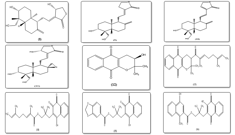 Methanol extract of Andrographispaniculataexhibited anti-cancer activity. Andrographolide(8), 14-deoxyandrographolide (9) and 14-deoxy-11, 12-didehydroandrographolide (10) were separated from this extract [18]. .Andrographolide(8) from the plant Andrographispaniculata (Acanthaecae) and its derivative 8, 17 -epoxy andrographolide(11) showed cytotoxic activity [19]. .Rhinacanthin-A (12), rhinacanthin-B (13), rhinacanthin-C (14), rhinacanthin-D (15), rhinacanthin-G, rhinacanthin-H, rhinacanthin-I, rhinacanthin-K,rhinacanthin-M, rhinacanthin-N (16), rhinacanthin-Q (17) and wogonin(18)separated from the roots of Rhinacanthusnasutus (Acanthaceae) showed cytotoxic activity. .The leaf and root extract of Rhinacanthusnasutus (Acanthaceae) showed antiproliferative activity against human cervix adenocarcinomaand other types of cancers [13].