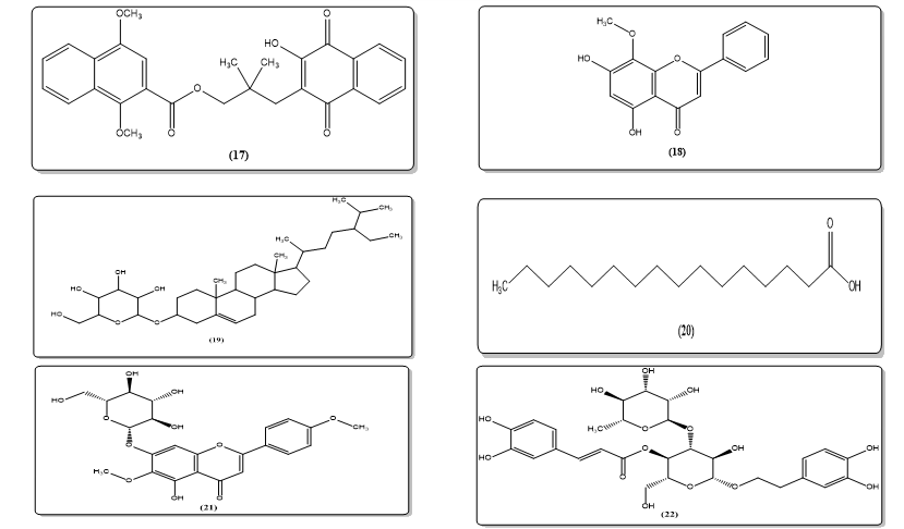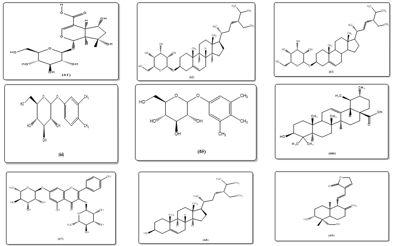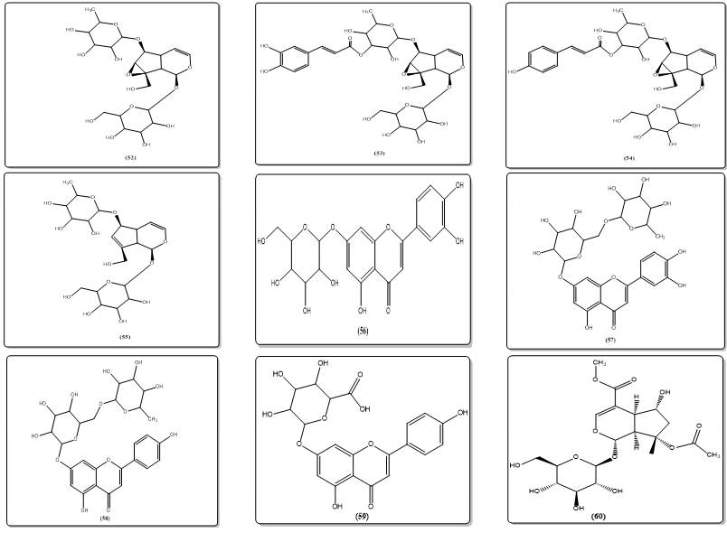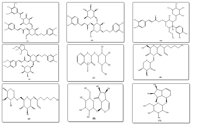 Chemical investigation of the methanol fraction of the aerial parts of Blepharisedulis (Forssk.) Pers. Family Acanthaceae revealed the presence of phenylethnoids namely verbascoside(44), cis-verbascoside, isoverbascoside(45) and leucosceptoside A (46) [28]. Glycoside compounds; sitosterol-β-D-glucopyranoside(62), stigmasterol-β-D-glucopyranoside(63), 3, 4-dimethylphenol-β-D-glucopyranoside(64) and 3, 4, 5-trimethylphenol-β-D-glucopyranoside(65) were isolated from leaves and stems of Rhinacanthusnasutus plant of family Acanthaceae [13].