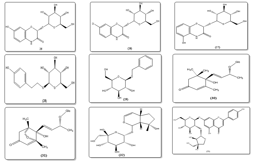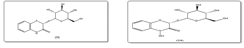 From the aerial parts of Acanthus ilicifolicus, which is a member of Acanthaceae family, (2R)-2-O-β-D-gluco-pyranosyl-2H-1,4-benzoxazin-3(4H)-one (23), (2R)-2-O-β-D-glucopyranosyl-4-hydroxy-2H-1,4-benzoxazin-3(4H)–one (24), (2R)-2-O-β- D-glucopyranosyl-7-hydroxy-2H-1,4-benzoxazin-3(4H)-one (25), 7-chloro-(2R)-2-O-β-D-glucopyranosyl-2H-1,4-benzoxazin-3(4H)-one (26) and (2R)-2-O-β-D-glucopyranosyl-5-hydroxy-2H-1,4-benzoxazin-3(4H)-one(27) have been isolated [31].