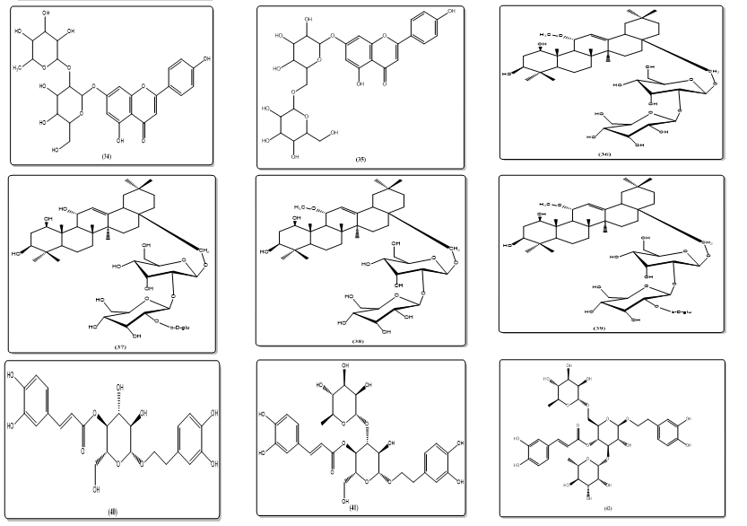 Olean-12-ene-1β,3β,11α,28-tetraol-28-O-β-D-glucopyranosyl-(1→2) -β-D-glucopyranoside (36), olean-12-ene-1β,3β,11α,28-tetraol-28-O-β-D-glucopyranosyl-(1→2)-β-D-glucopyranosyl-(1→2)-β-D-gluco pyranoside(37), 11α-methoxy-olean-12-ene-1β,3β,28-triol-28-O-β-D-glucopyranosyl-(1→2)-β-D-glucopyranoside(38) and 11α-methoxy-olean-12-ene-1β, 3β, 28-triol 28-O-β-Dglucopyranosyl-(1→2)-β-D-glucopyranosyl-(1→2)-β-D-glucopyranoside (39) were reported from JusticiabetonicaL. .belonging to family Acanthaceae [33]. Three phenylethnoid glycosides, desrhamnosylacteoside(40), acteoside (41) and poliumoside(42) were separated and identified from the callus cultures of Barleriacristata L. of family Acanthaceae [34].