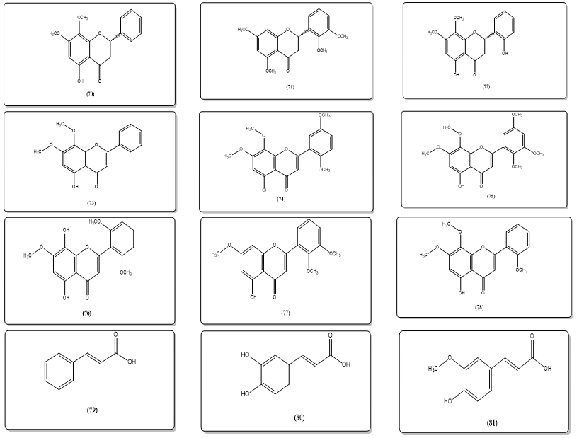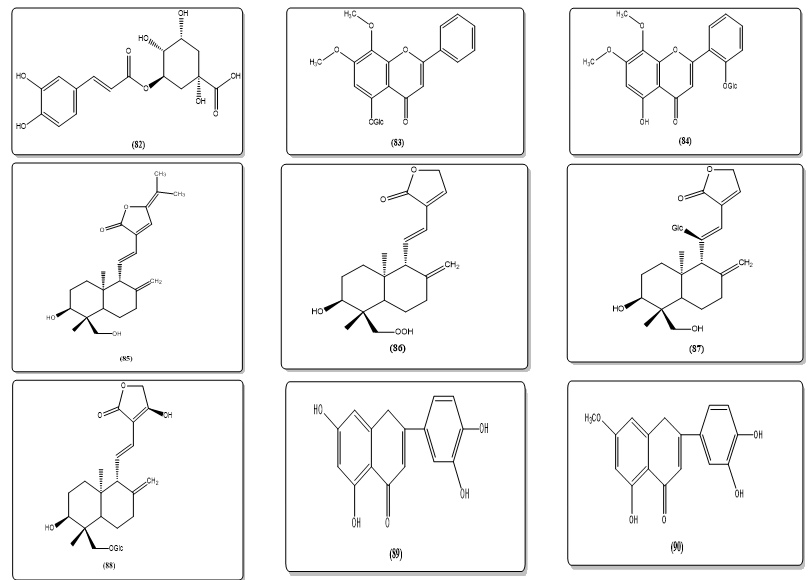 From the crude ethanol extract of Brillantaisiapalisatii (Acanthaceae) 3-epi-ursolic acid (66), verbascoside(44) and lespedin(67) were isolated[39]. Following compounds were reported from Andrographispaniculata (Acanthaceae); β-sitosterol(68), andrographolide(8),14-deoxy-ll,12-dedihydro andrographolide,14-deoxyandrographolide (69), 7-O-methyldihydrowogonin (70), (2S)-5,7,2’,3’-tetramethoxyflavanone (71), dihydroskullcapflavone I (72), 7-O-methylwogonin (73), 5-hydroxy-7,8,2’,5’-tetramethoxy-flavone (74), 5-hydroxy-7,8,2’,3’-tetramethoxyflavone (75), 5-hydroxy-7,2’,6’-trimethoxyflavone(76), 5-hydroxy-7,2’,3’-trimethoxyflavone(77), skullcapflavone12’-methylether (78), cinnamic acid(79), caffeic acid (80), ferulic acid (81), chlorogenic acid (82), 7-O-methylwogonin 5-glucoside (83), skullcapflavone I 2’-glucoside (84), 14-deoxy- 15-isopropylidene-11,12-didehydro-andrographolide(85), 14-deoxy-11-hydroxyandro grapholide (86), neoandrographolide(87) and andro graphoside(88) [40]. Chromatographic resolution of ethyl acetate extract of leaves of Barleriacristata furnished two flavonoid compounds, which were further identified and characterizes as luteoline(89) and 7-methoxy luteoline(90)[41]. Coumarins, (+)-pracruptorin, umbelliferone(91) and 2, 6-dimethoxy benzoquinone (92)derivedfrom the whole plant of Rhinacanthusnasutus plant of family Acanthaceae [13].
