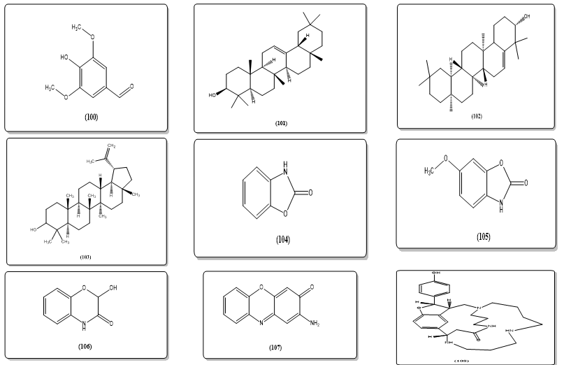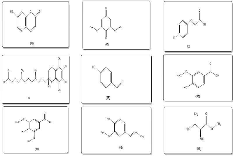 The benzonoids compounds p-hydroxy-benzaldehyde(95), vanillic acid (96), syringic acid (97), 2-methoxy-propionolphenol (98), methyl valinate(99) and syringaldehyde(100) were isolated from leaves, roots and stems of Rhinacanthusnasutus plant of family Acanthaceae [41].