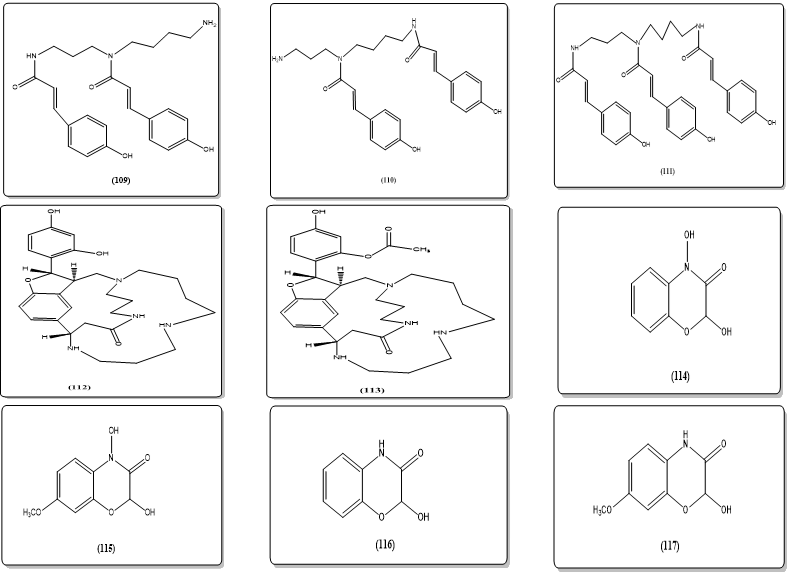 Both 2-benzoxazolinone (104) and 2-hydroxy-1, 4-benzoxazin-3-one (106) are compounds calledphytoanticipins and present in healthy plants as substances toovercome microbial diseases and herbivore[46].