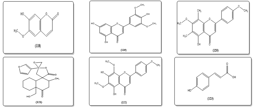 Several compounds were isolated and identified from the leaves and stems of Aphelandra aurantiaca which consists of scopoletin(118), chrysin(119), eucalyptin(120), gnaphalin(121), nevadensin(122) and p-coumaric acid (123) in the form of ester with glucose [53].