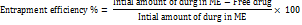 Entrapment efficiency of mucoadhesive microemulsion was determined by the centrifugation method. Mucoadhesive micro-emulsion (containing an equivalent to 50 mg of drug) was centrifuged at 20000 rpm for 1 h in a refrigerated centrifuge to collect the supernatant liquid. The collected liquid was filtered to measure the free drug concentration after suitable dilution with methanol. The absorbance was measured at 230 nm in a uv spectrophotometer to calculate the entrapment efficiency using the following formula: