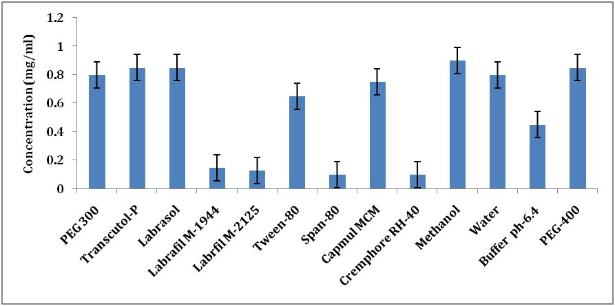 Fig. 1: Solubility data of dlx-hcl in various excipients, (mean±SD, N=3)