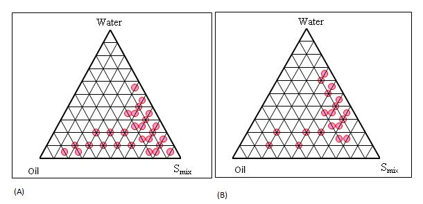 Fig. 2: Pseudo-ternary phase diagram with different Smix ratio i.e., (A) 1:1 and (B) 2:1. (N=3)