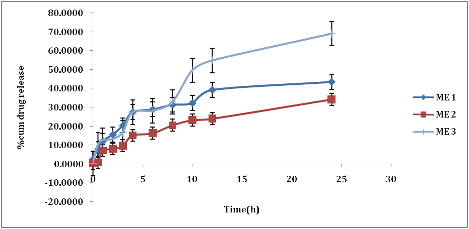 In vitro release studies were carried out on Franz-diffusion cell using cellophane membranes as a barrier of the selected formulations i.e. ME1, ME2, and ME3. The cumulative percentage drug release at different time intervals of different formulations are shown in fig. 3. Data obtained from in vitro release experiments depicted that drug released from the formulation in a controlled manner and exhibiting sustained release.