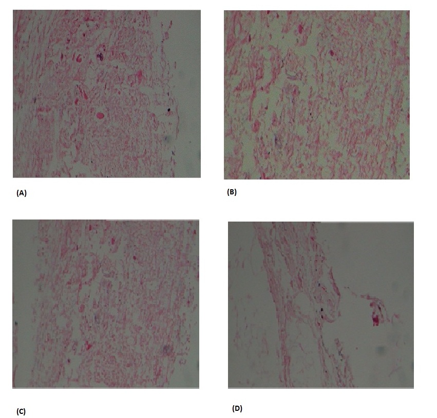Fig. 5: Histopathology of (A) Formulation F1 (B) Formulation F2 (C) Nasal membrane treated with phosphate buffer (D) Nasal membrane treated with isopropyl alcohol, (N=3)