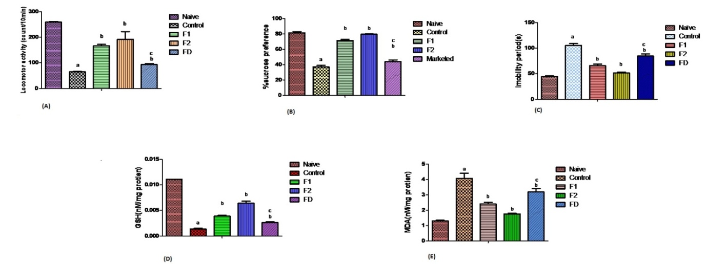 Fig. 6: Effect of intranasal formulation (F1 and F2), oral formulation (FD) on (A) locomotor score (B) sucrose preference (C) immobility time in the FST (D) reduced glutathione levels in the hippocampal region (E) lipid peroxidation in the hippocampal region, of stress-induced rats, (mean±SD, N=3)