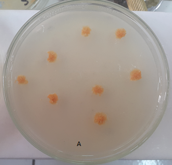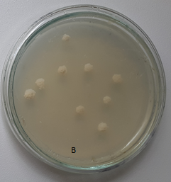 Fig. 1: Colonies of M. smegmatis transformed with pC51 plasmid (A) and M. smegmatis none transformed (B)