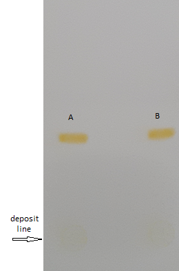 Fig. 2: TLC analysis of lycopene extracted from tomato (A) and pigment produced by M. smegmatis transformed with pC51 plasmid (B)