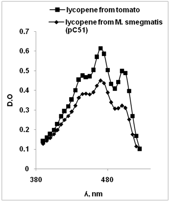The lycopene levels were determined using stationary-phase-grown cells by extraction followed by spectral analysis. The M. smegmatis transformed by pC51 yielded value of 1.41± 3.09 mg/g (dry weight) of lycopene.