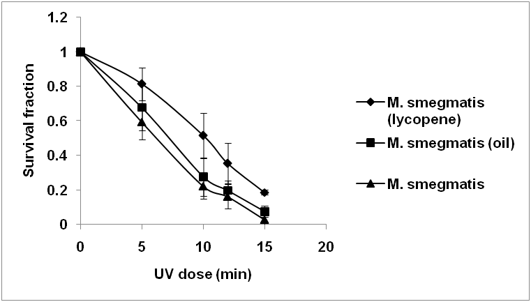 In conclusion, M. smegmatis used as a host of a plasmid containing lycopene genes can form orange colonies on sauton plate, and the production found to be important (1.41 mg/g (dry weight) of lycopene). It was found that this carotene has antioxidant activities and protect the bacterial cells from the lethal action of UV irradiation in vivo and in vitro and deserves additional research to improve the production of lycopene by M. smegmatis in order to use it as a bio-alternative source for large-scale production.