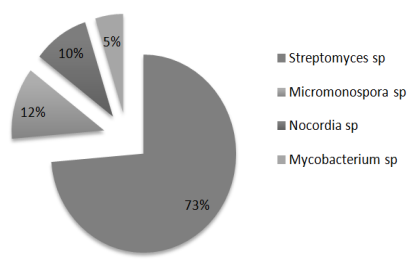 The distribution of actinobacteria including Streptomyces sp. (73%), Micromonospora sp. (12%), Nocordia sp. (10%) and Mycobacterium sp. (5%) were identified (Fig. 2).