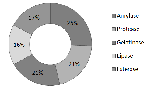 A positive result for amylase (25%), protease (21%), lipase (16%) esterase (17%) and gelatinase (21%) was showed that isolates exhibited enzyme activity (Fig.4; Table.2).
