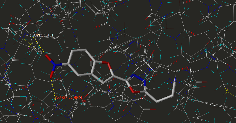 Compound 3e, 3c and 3f exhibited a docking score of 6.6198, 6.3832 and 6.0524, respectively. Wherein, the nitro function at C5 of the benzofuran moiety is involved in the hydrogen bond interaction with Arg499HH11 and Phe504H residues. Apart from the nitro group interaction, the compound 3c and 3f also exhibited hydrogen bond interaction between the nitrogen of the oxadiazole moiety and AArg106HH12 residue.