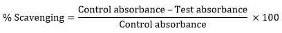 The in vitro antioxidant activity was carried out by DPPH radical scavenging assay method with suitable modification [51]. In brief, the assay was carried out using UV spectrophotometer at 517 nm. To the 1 mL solution of synthesized compounds (10-4 M), 1 mL DPPH solution (25 µM) was added into the test tube. The solution was incubated at 37 °C for 30 min and the absorbance of each solution was measured at 517 nm against the reagent blank solution. The ascorbic acid (25 µM) was used as the reference antioxidant. The experimental values summarized for DPPH radical scavenging assays are expressed as the mean ± standard error of mean (SEM). The percent free radical scavenging activity was calculated by the formula given below.