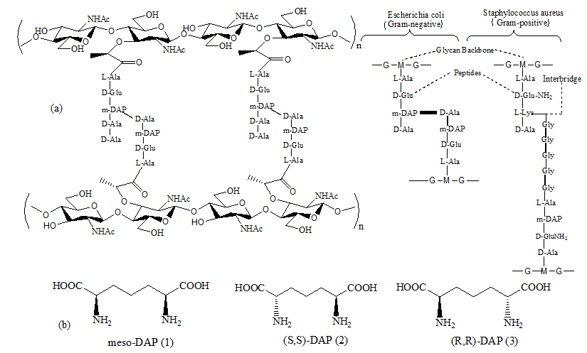 Fig. 1: (a) Peptidoglycan structure with peptide cross-linking in gram positive and gram negative bacteria. (b) Stereoisomers of diaminopimelic acid (DAP).