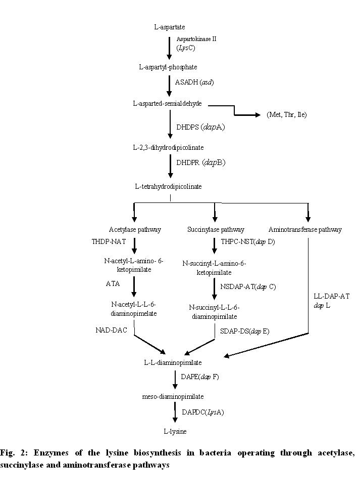This review describes the essential details of the key enzymes functioning in the lysine biosynthetic pathway. Enzymes of this pathway are the products of essential bacterial genes that are not expressed in humans. The pathway is of interest to antibiotic discovery research. Accordingly, it also gives the current status of rational drug design initiatives targeting essential enzymes of the lysine biosynthesis pathway in resistant strains of pathogenic bacteria. More recently, cloning and expression of the DAP pathway components has facilitated detailed investigations and structures of the enzymes have been determined by X-ray crystallography [25].